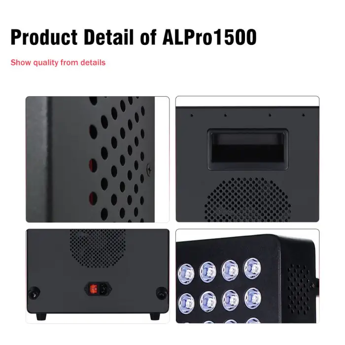 Key specifications include a model number of ALPro1500, an irradiance of over 190 mw/cm², multiple wavelengths (480nm, 630nm, 660nm, 810nm, 830nm, 850nm, 940nm), a power of 1500W, and a treatment area that covers the full body.