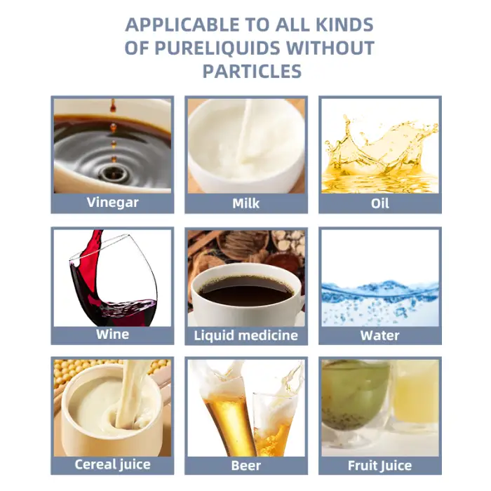 This machine is suitable for packaging various liquid products, including pure drinking water, juices, and teas.