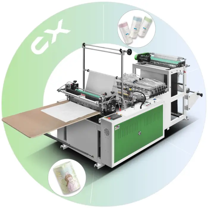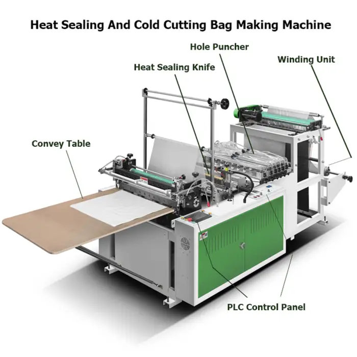 The machine is designed for producing plastic bags, and it is compatible with various types of plastic materials.