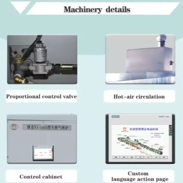 Key features include high productivity, energy-saving design, customizable power options, and the capability to bake a variety of snacks.