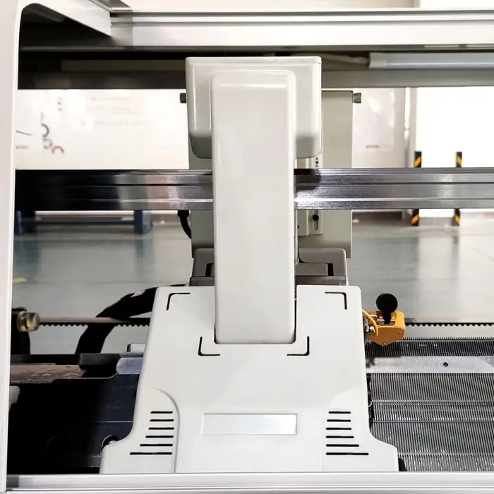 Key features include automatic operation, a single carriage system, low failure rate, high-speed knitting, and versatile knitting options.