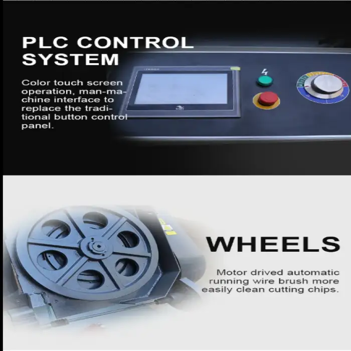 The machine utilizes hydraulic clamping for secure and stable cutting operations.