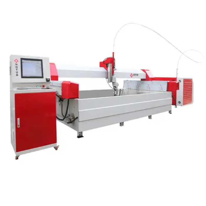 The CNC Sawjet 5 Axis Stone Bridge Saw is designed to cut various materials including granite, marble, quartz, and sandstone.