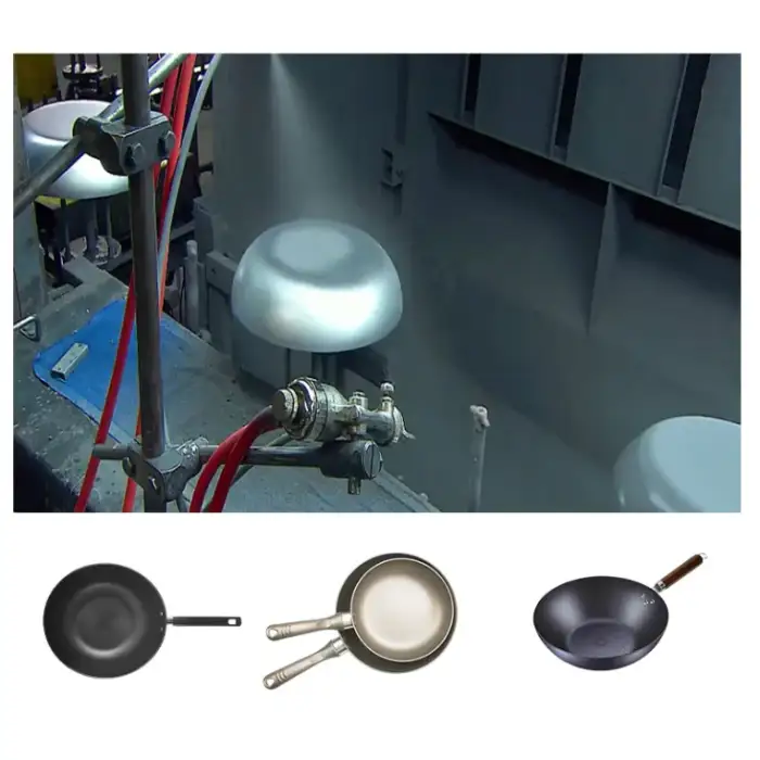 This machine is designed for producing aluminum and stainless steel cookware, including pots, pans, and various kitchenware items.