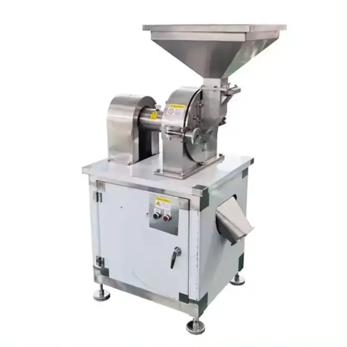 This grinder is designed to process a variety of materials including coffee beans, cocoa, salt, sugar, and can also be used for chemical applications.