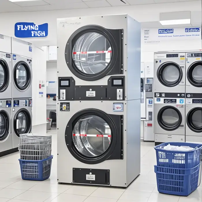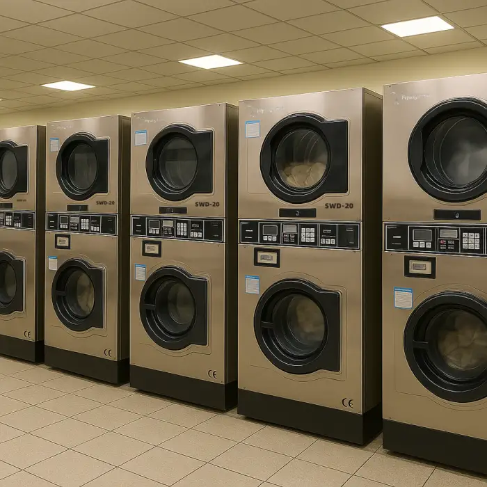 The machine is coin-operated and supports multiple coins and tokens, making it easy for users to access laundry services.