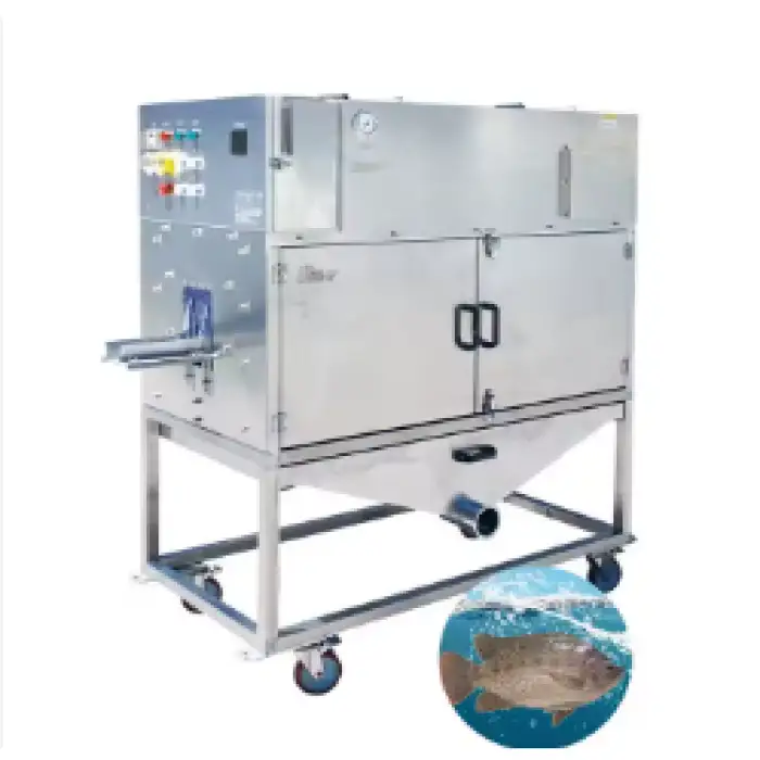 The machine is designed with safety in mind, incorporating features that ensure safe operation during fish processing.