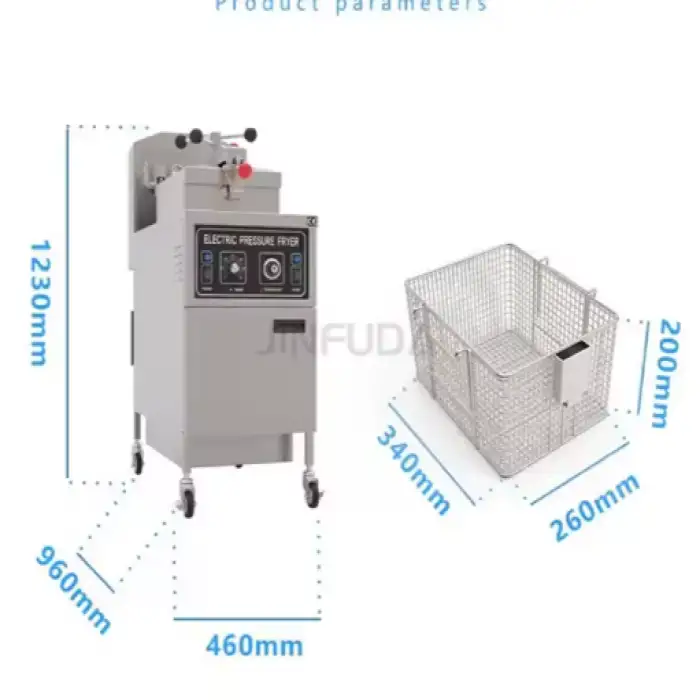 The dimensions of the fryer are 460 mm in width, 960 mm in length, and 1230 mm in height.