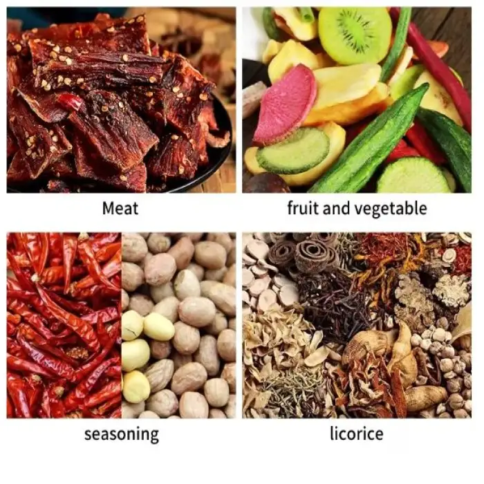 Applications include dehydrating fruits for snacks and baking, preparing vegetables for long-term storage, and drying seafood for preservation and flavor enhancement.