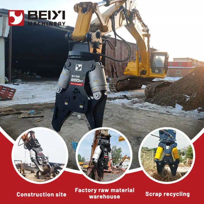 This attachment is designed to crush and shear concrete and metal, making it ideal for demolition and recycling projects.