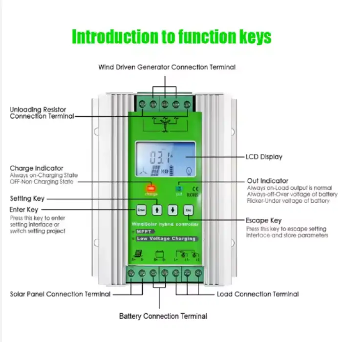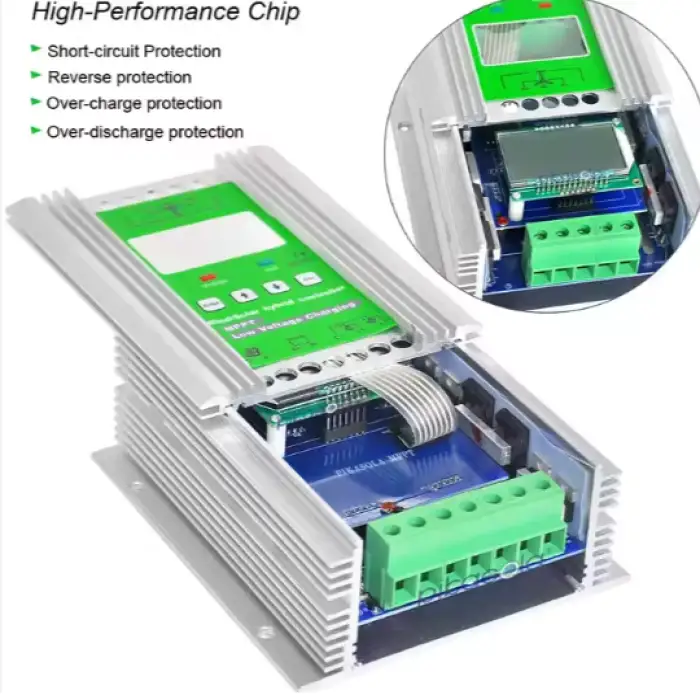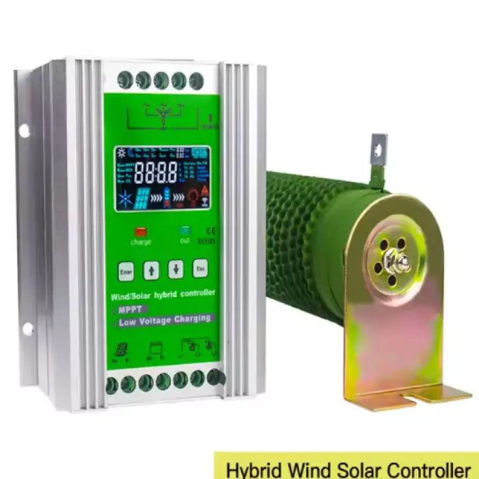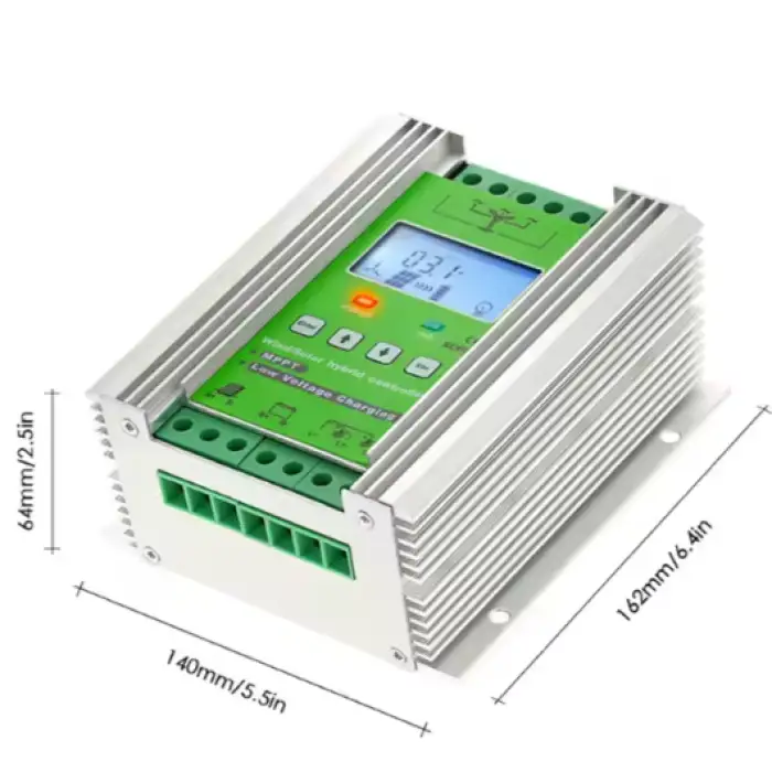 The controller utilizes advanced Maximum Power Point Tracking (MPPT) technology to maximize energy capture from both wind and solar sources.
