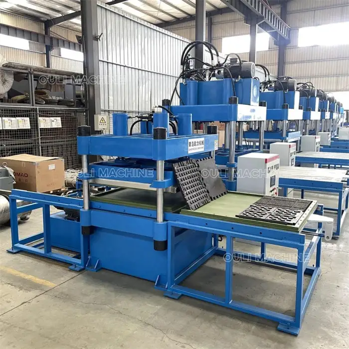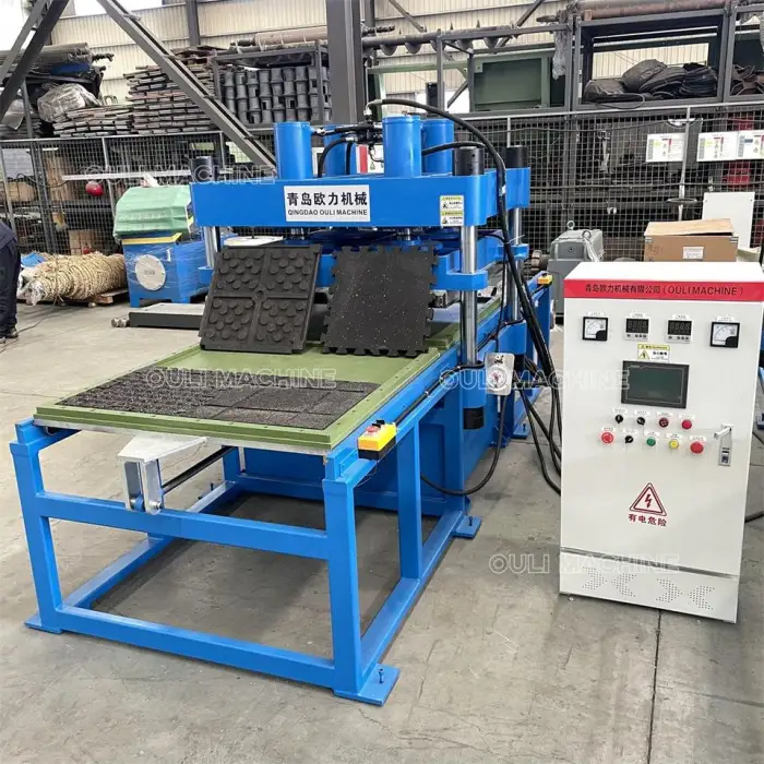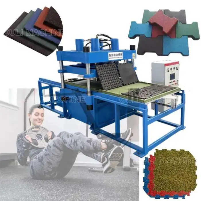 The machine is suitable for manufacturing interlocking rubber tiles for gyms, producing durable flooring for commercial spaces, creating custom rubber mats, fabricating rubber bricks for construction, and making specialized flooring for sports facilities.