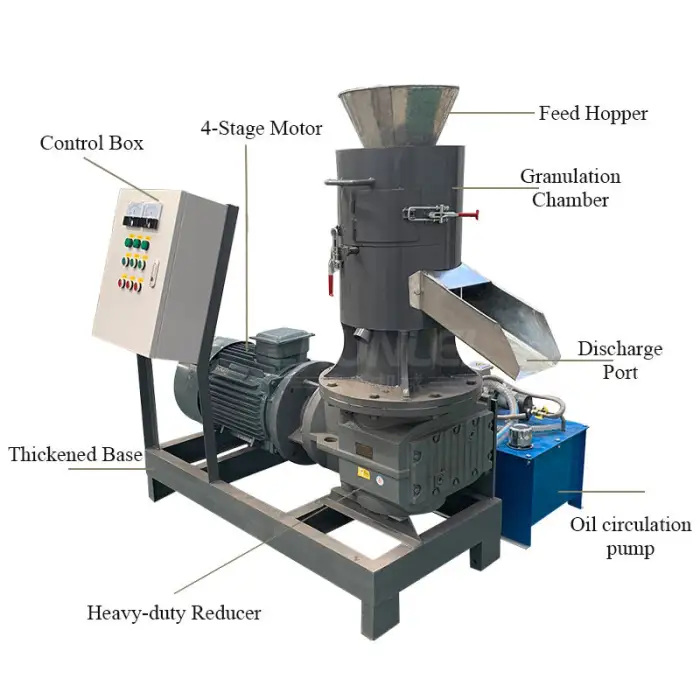 Key features include high production efficiency, durable components, adjustable pellet diameter, and a robust design for long-lasting operation.