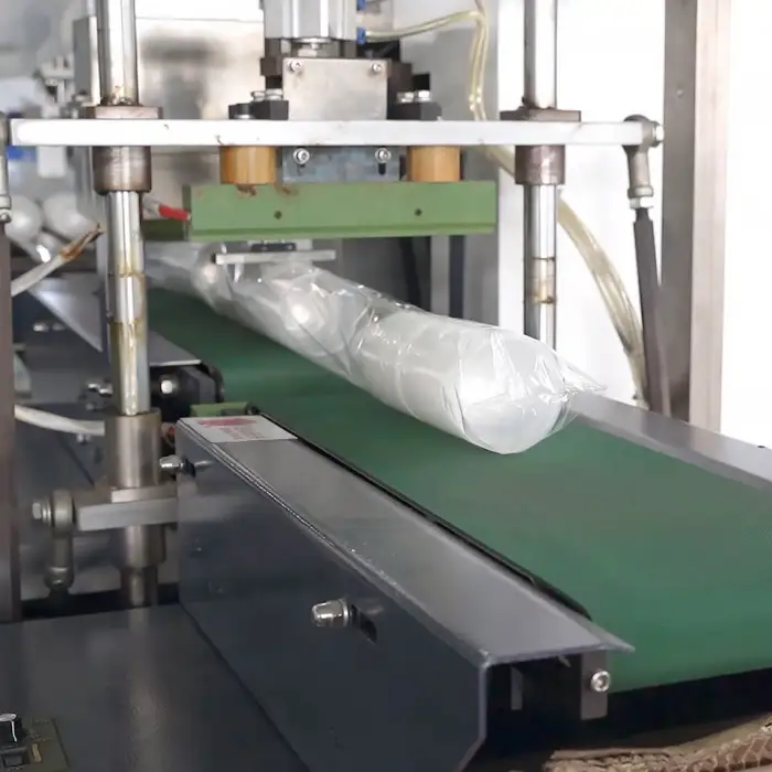 The machine is equipped with a safety door that ensures secure operation during the production process.