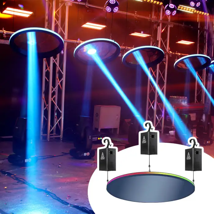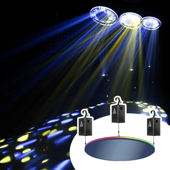 The DMX Kinetic Disc Light Unit creates a vibrant atmosphere with its bright RGBW LED colors.