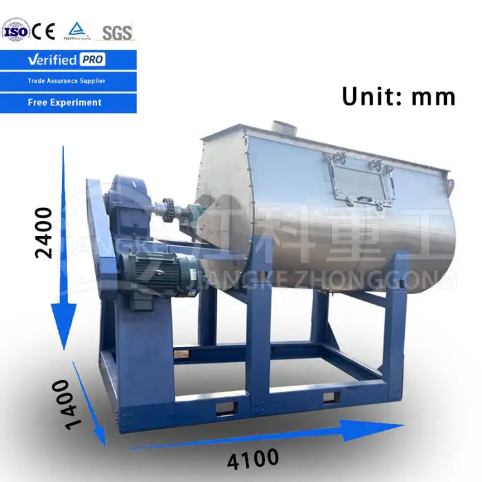 The machine utilizes a spiral ribbon mixing type for effective blending.