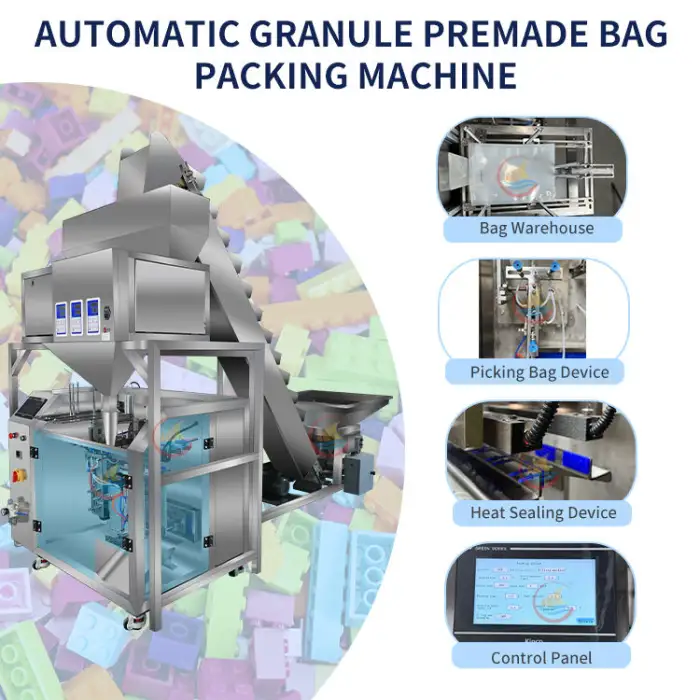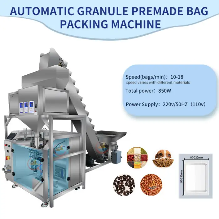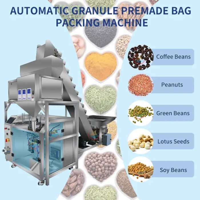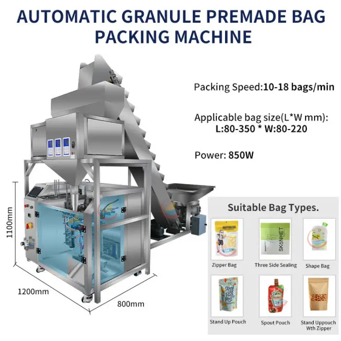 The Doypack Seeds Bagging Machine has a measuring range of 20-500g for filling granules.