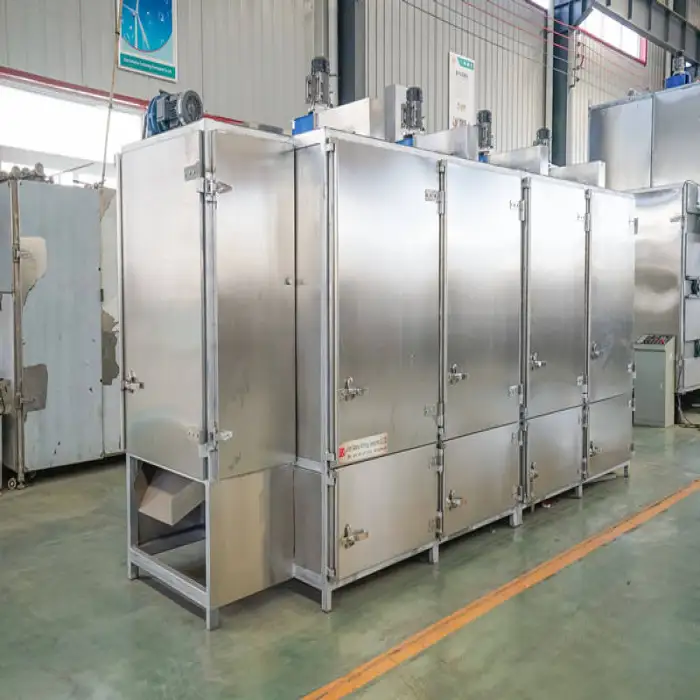 The machine is constructed from food-grade stainless steel, ensuring durability and safety in food processing.