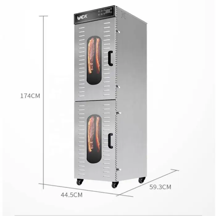 The dimensions of the Drying Fish Sausage Meat Dehydrator are 44.5 cm in width, 59.3 cm in depth, and 174 cm in height.