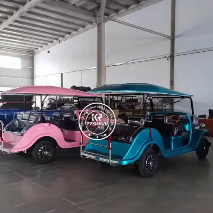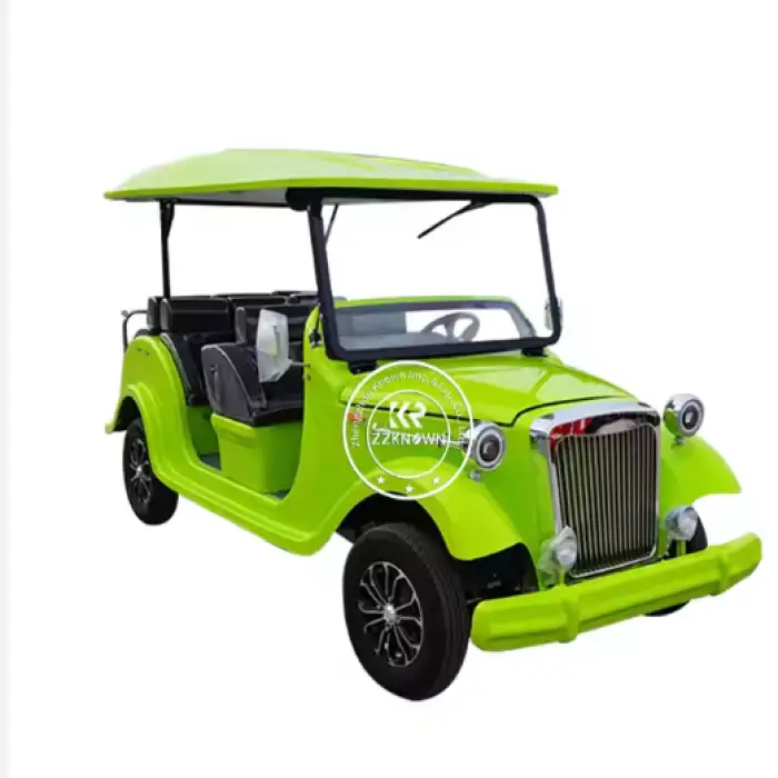 The electric golf cart is powered by a high-capacity rechargeable battery that provides efficient performance and long-lasting usage.
