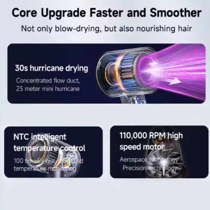 Thanks to its high-speed brushless motor, the hair dryer can dry hair quickly and efficiently.