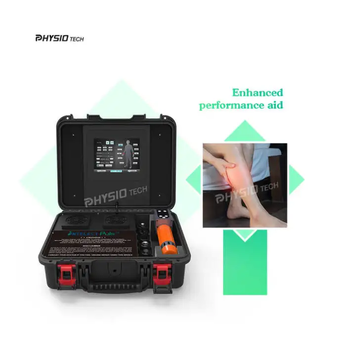 Key features include advanced shockwave technology, a user-friendly 8-inch touch screen, a lightweight design for portability, multiple energy settings from 1 to 16 Hz, and 7PCS transmitters for versatile use.