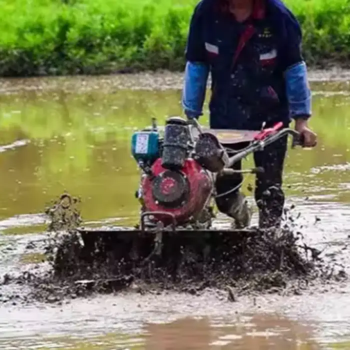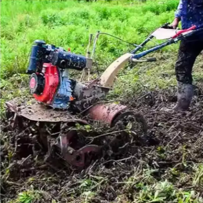 The cultivator operates on a four-wheel drive system, providing better traction and stability.