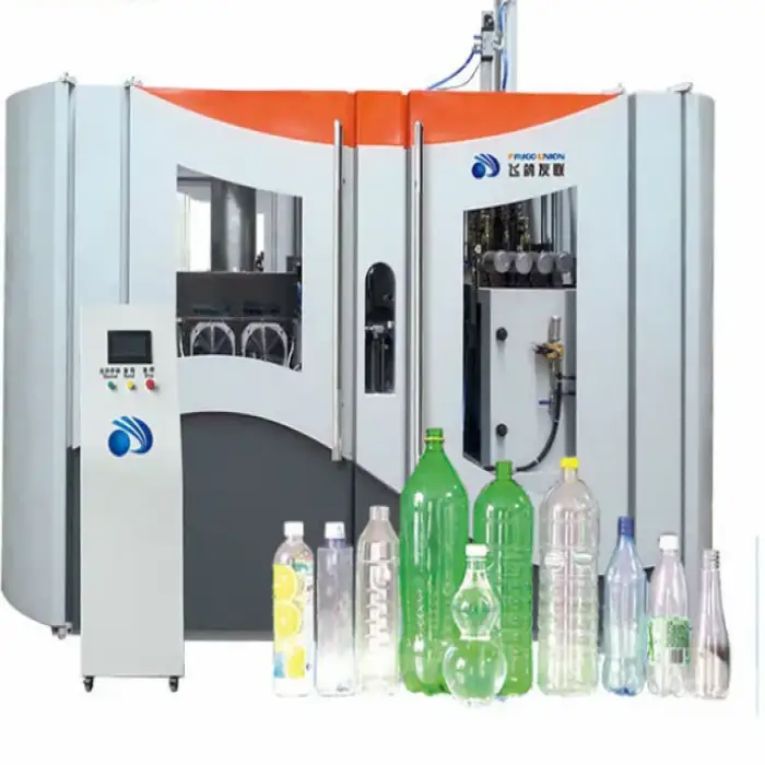 The Faygo Union 2 4 6 8 Cavity Fully Automatic PET Bottle Making Machine can produce bottles with a maximum diameter of 200 mm and a maximum height of 350 mm.