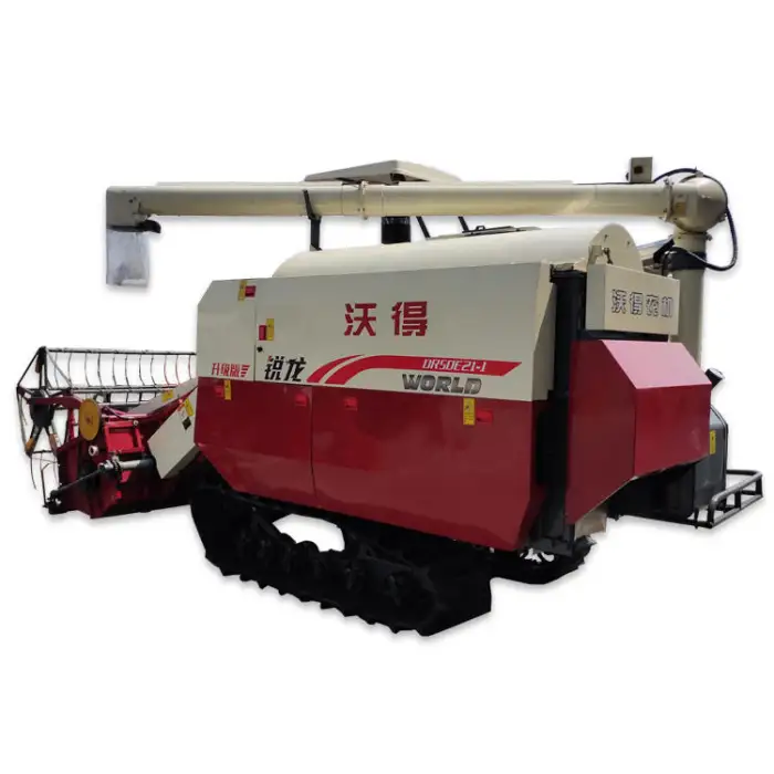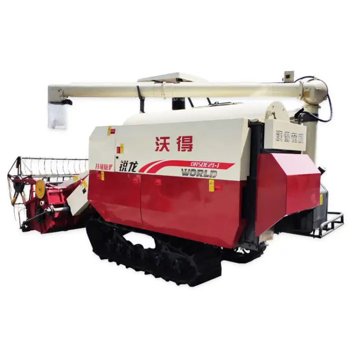 The FM World 4LZ-5.0E is designed to efficiently harvest a variety of crops including rice, wheat, soybeans, and corn.