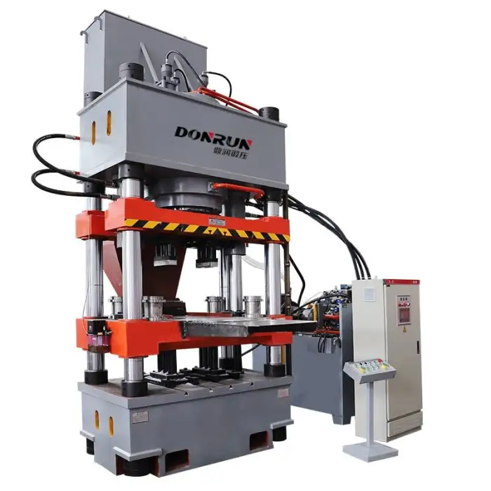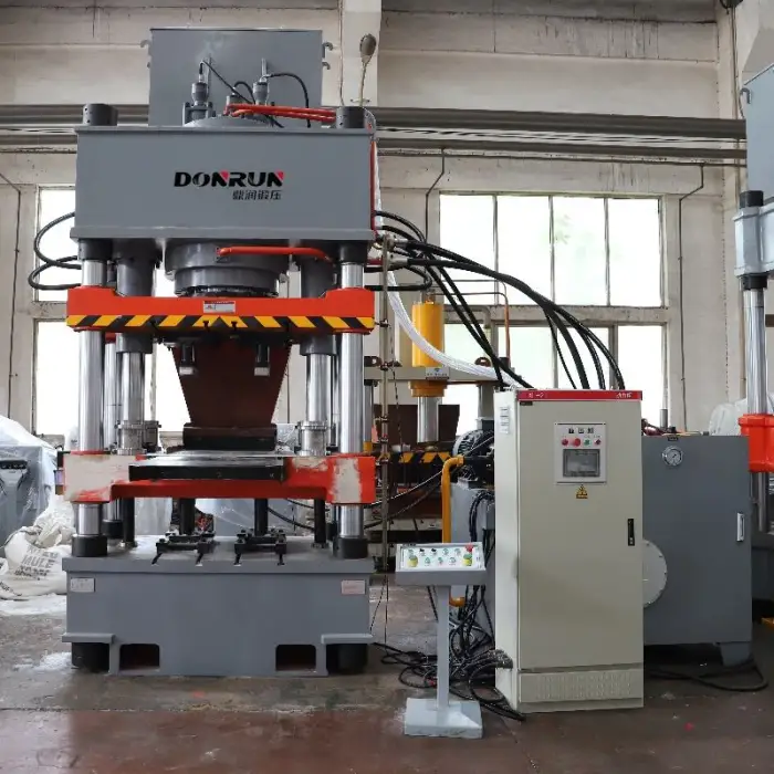The hydraulic press can handle various metalworking tasks including drilling, pressing, and manufacturing operations.