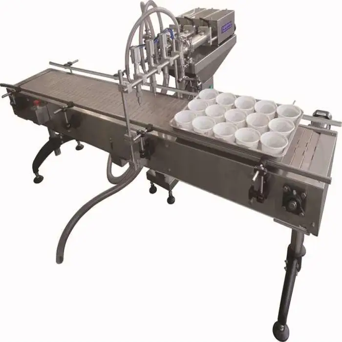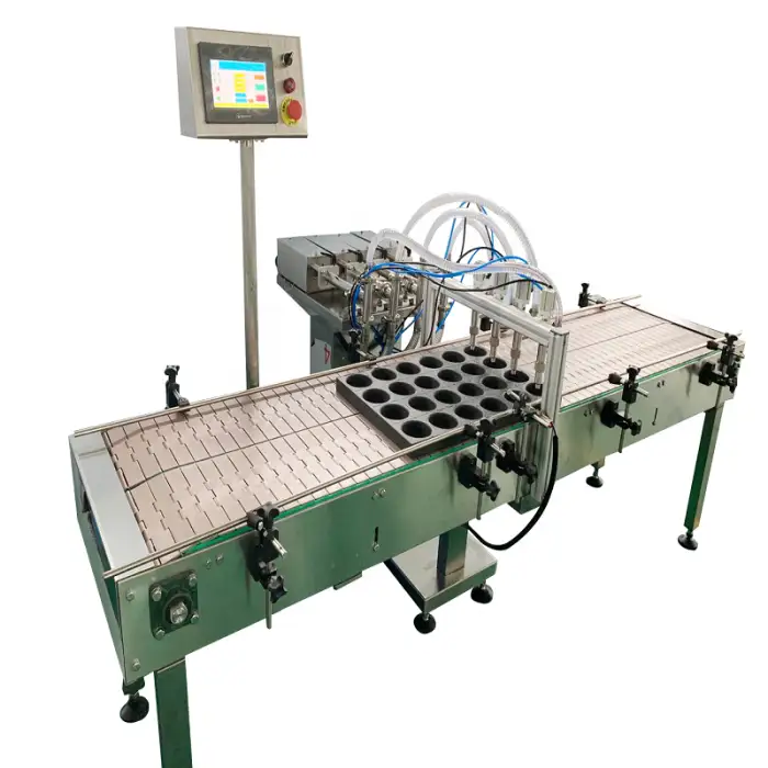 The machine is suitable for various industries including beverage production, dairy products, ice cream packaging, and chemical liquid filling.