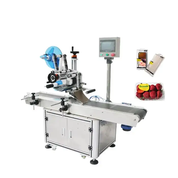 This machine is designed for labeling flat surfaces, including cartons, food packaging, and vegetable bags.