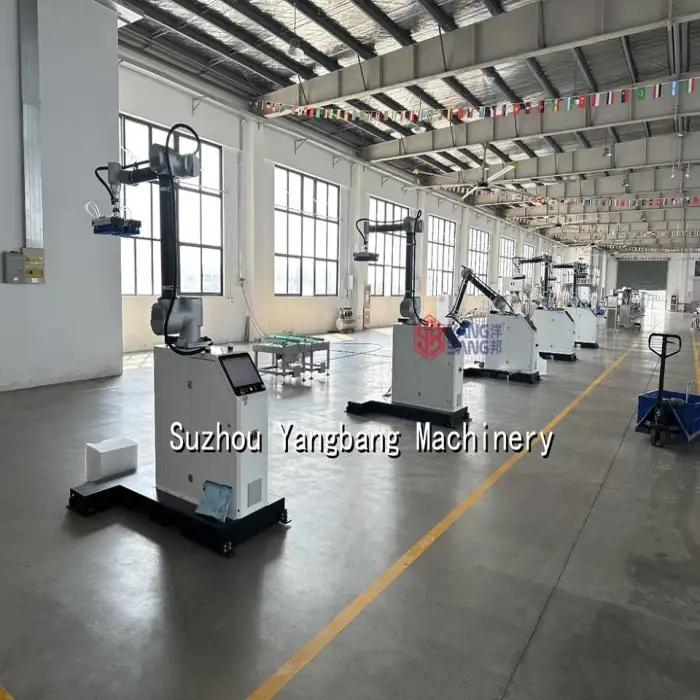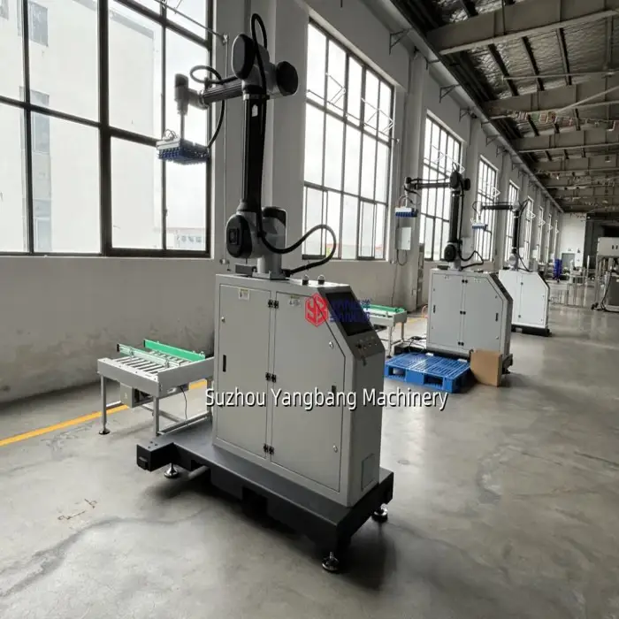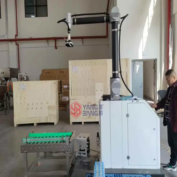 The Fully Automatic Robot Palletizer is designed to handle a variety of products, including bottles, cartons, boxes, bags, and tin cans.