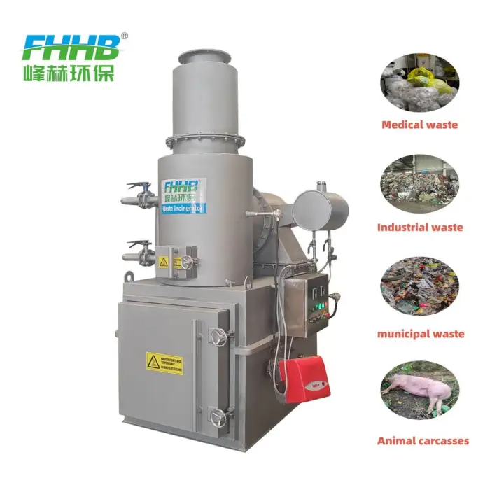 The primary function of the FHHB Multi Functional Garbage Incinerator is to safely and efficiently dispose of various types of waste, particularly medical and industrial waste, through smokeless pyrolysis technology.