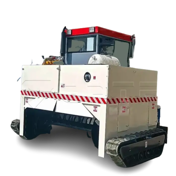 The compost turner is equipped with two tracks that facilitate a free-running fermentation process, helping to speed up material breakdown and shorten the fermentation time.