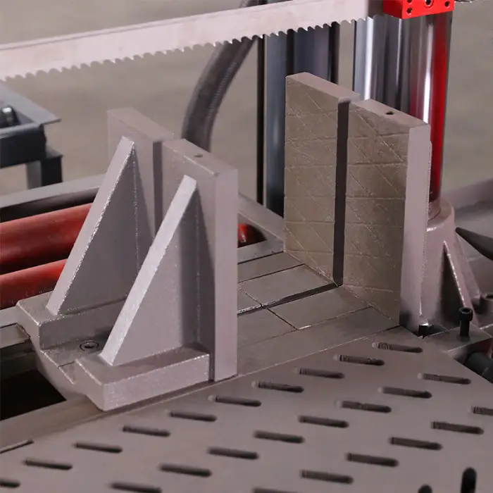 Key features include high accuracy cutting capability, hydraulic operation, manual saw blade tension for easy adjustments, and robust construction for durability.