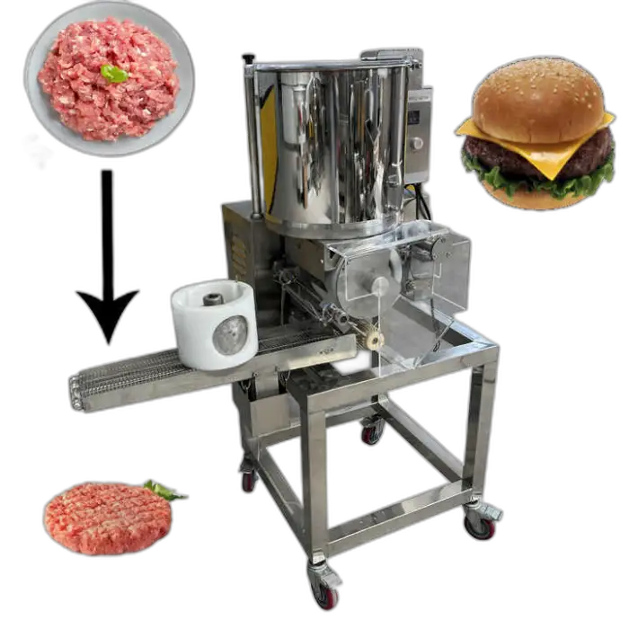 The machine is designed to form meat patties, including beef burgers and mixed formulations (for example potato–beef mixtures or other minced-meat blends). It produces uniform patties suitable for restaurants, food trucks, catering and food production.