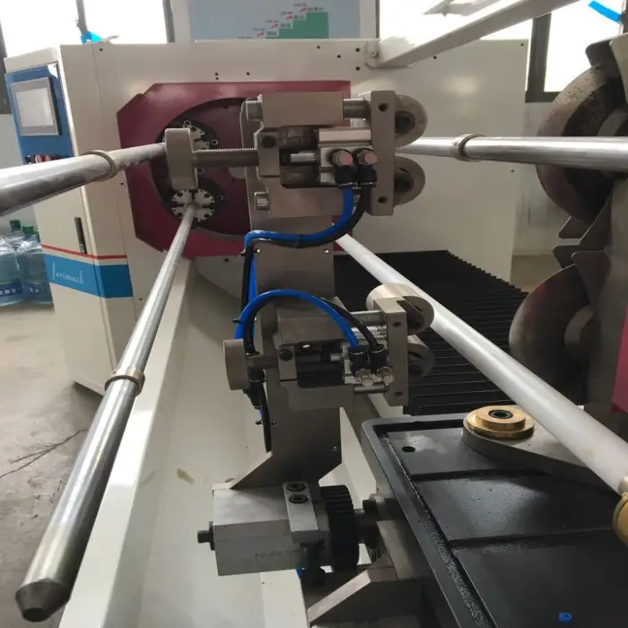 The machine is equipped with safety features such as emergency stop buttons and protective covers to ensure safe operation.