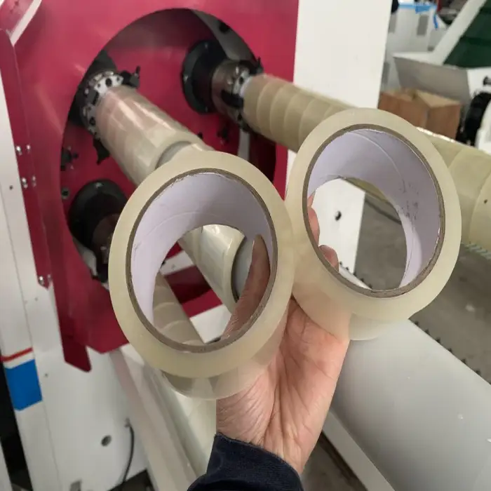 The machine features high efficiency in cutting adhesive tape rolls, automatic operation for increased productivity, a user-friendly PLC control system with an English panel, a robust design with four shafts for stability, and is suitable for various tape materials including Bopp and Opp.