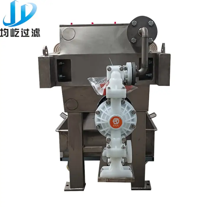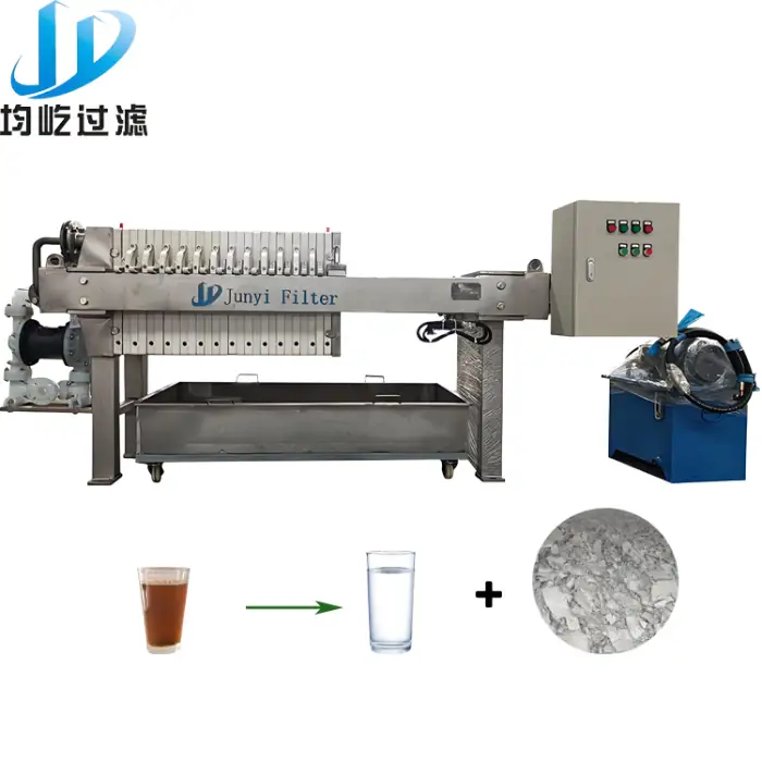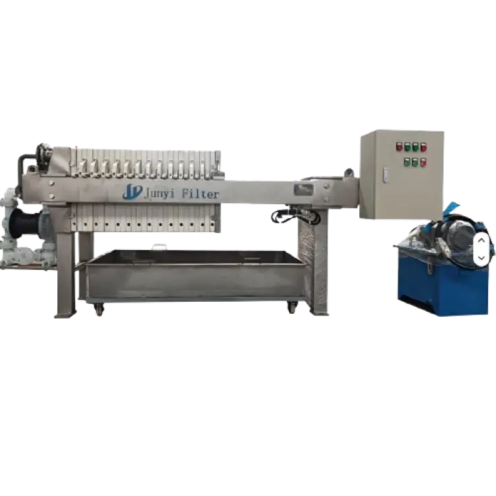 The filter press features a robust construction made of stainless steel, ensuring durability and reliability.