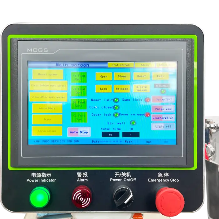 The kettle can be controlled using a button system or a PLC system from brands like SIMENS or ABB for enhanced precision.