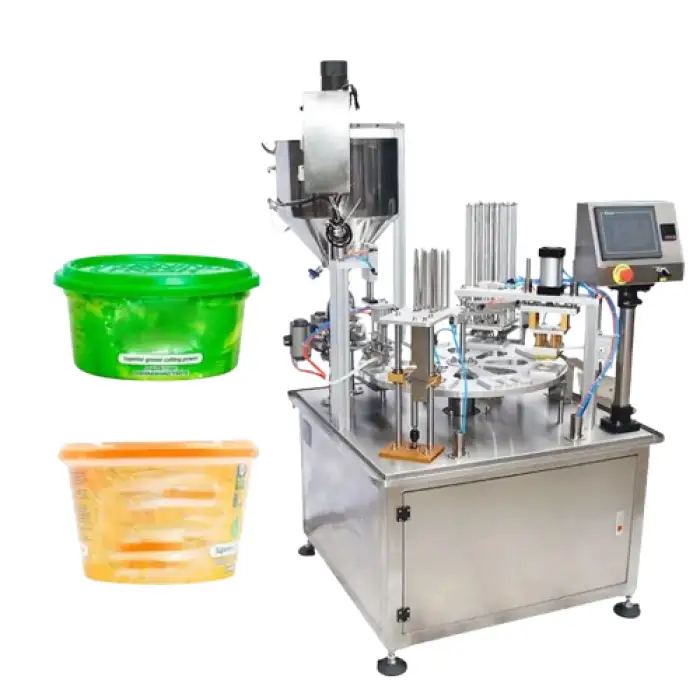 The machine can fill a variety of materials including water, oil, juice, powders, viscous liquids, soda, honey, rice, paste, grain, paint, ketchup, peanut butter, jam, tea, shampoo, liquor, yogurt, glue, and nail polish.