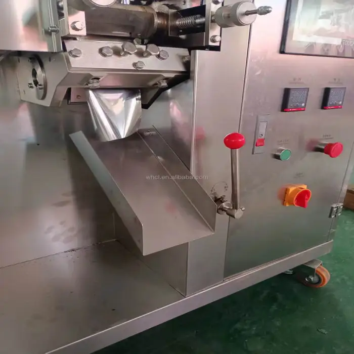 The machine performs filling, wrapping, and labeling functions, making it a multifunctional packing solution.