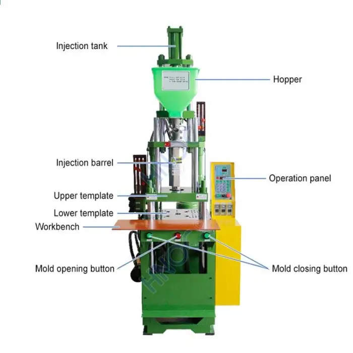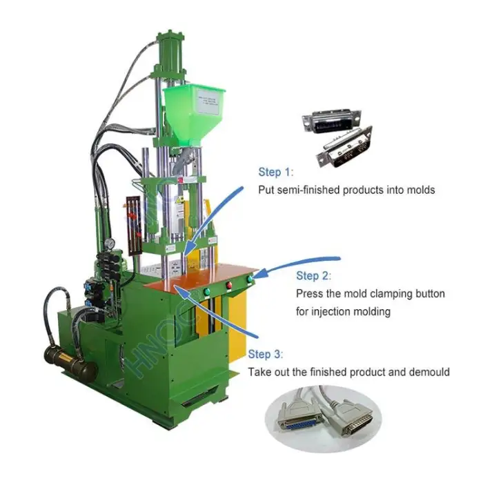 The HNOC Mini Vertical Injection Molding Machine can process various types of plastics including PP, PC, ABS, PET, PVC, HDPE, PA, and PE.