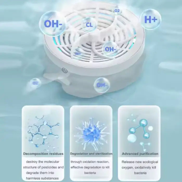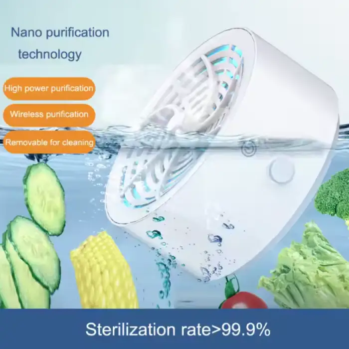It uses advanced technology to purify and sterilize food items by removing dirt and contaminants, providing a safe and fresh cleaning experience.