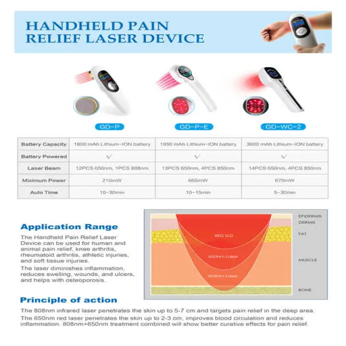 The device uses dual laser wavelengths of 808nm and 650nm to penetrate tissues, providing effective pain relief and promoting healing.