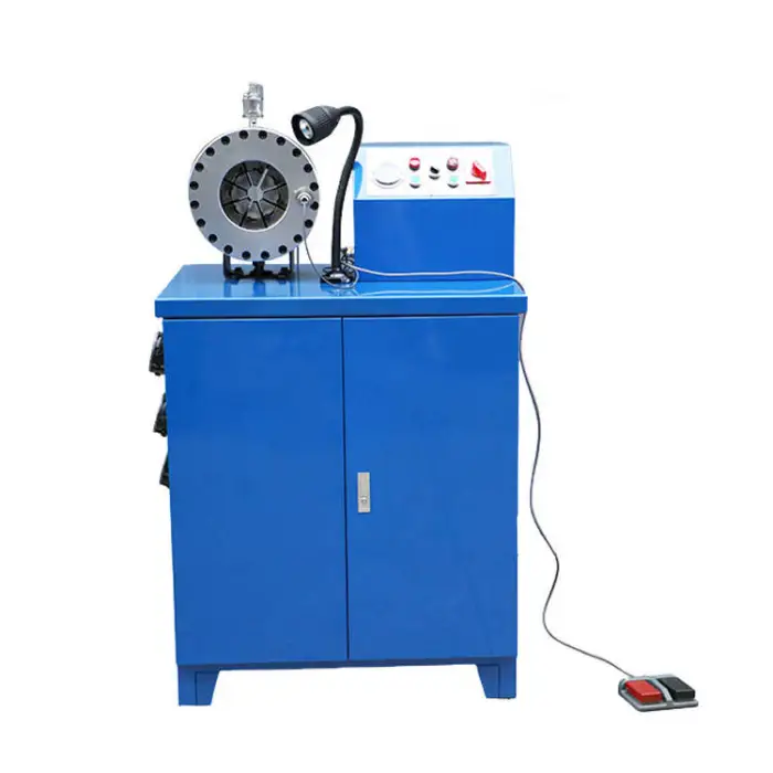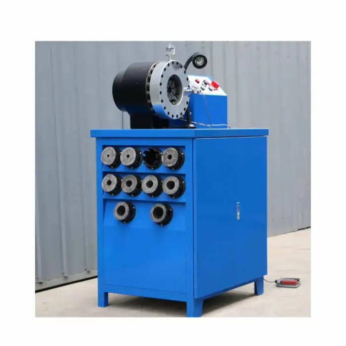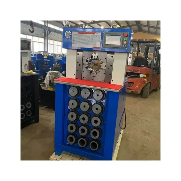 The machine is used for crimping rubber hoses in automotive repairs, manufacturing hydraulic systems, industrial applications requiring high-pressure hose fittings, and assembling micro oil pipes and locking tubes.