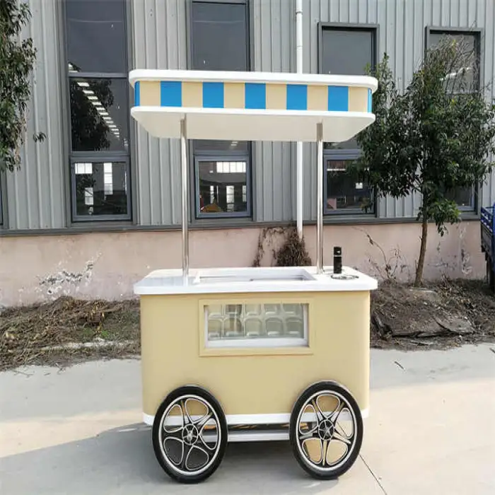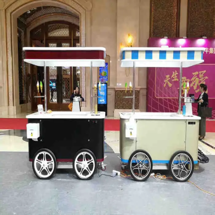 The cart is suitable for serving a variety of ice cream types, including soft serve, popsicles, and other frozen desserts.