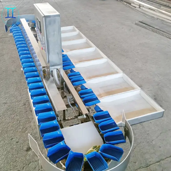 The machine sorts produce by size and weight, ensuring high-quality grading for better quality control.