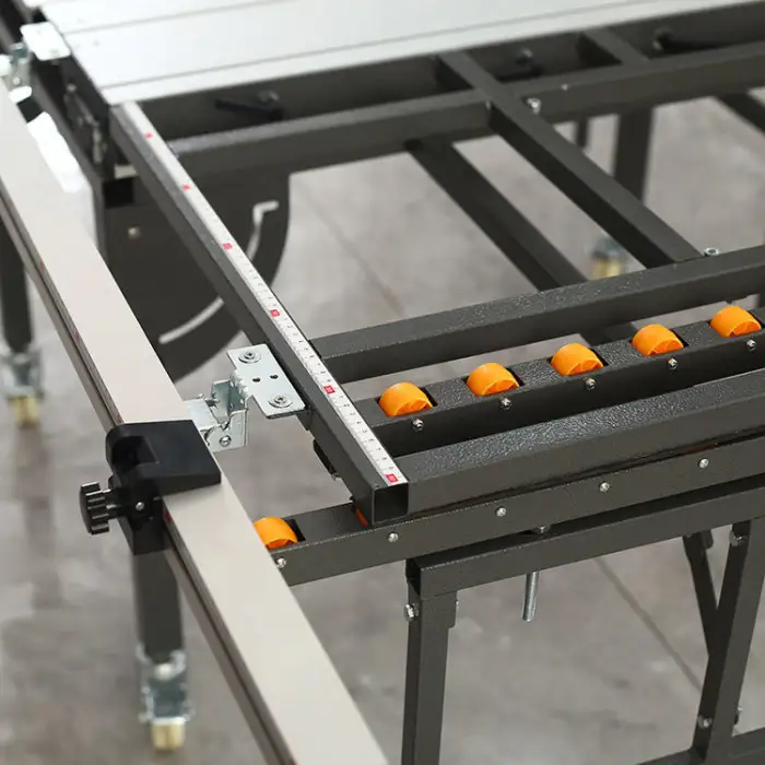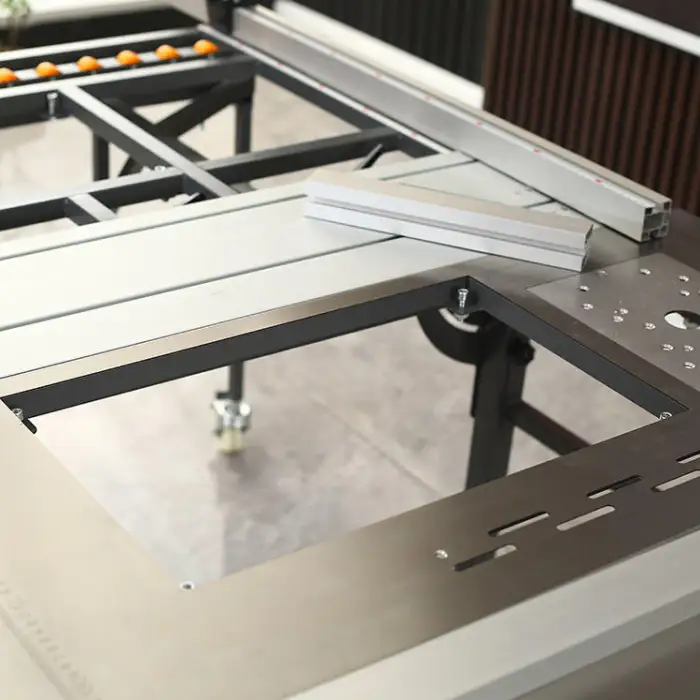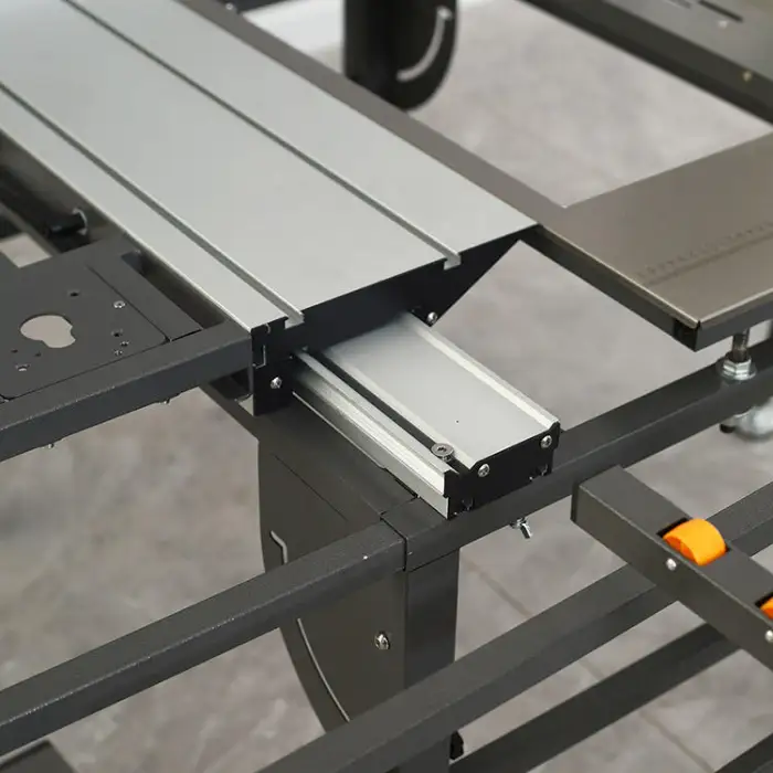The sliding table measures 240 cm by 75 cm, allowing for smooth and precise movements while cutting.